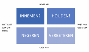 De opbrengst van dit type onderzoek is een compleet beeld van wat de klanten vinden van alle aanbieders in de category. In een kwadrant worden de associaties die verbonden zijn met een hoge NPS score zichtbaar, en ook de kwalificaties die juist samengaan met de lage tevredenheidsscores. Zo wordt glashelder waar vervolgens aandacht aan moet worden gegeven. De associaties die aan uw merk kleven met een hoge NPS, die moet u koesteren. Linksboven in het kwadrant staan de associaties die u kunt overwegen te versterken, want ze zijn nog vrij. Rechtsonder staan de gedachten die klanten bij uw merk hebben die uw scores juist verlagen, daar moet u van weg. De associaties linksonder kunt u beter negeren.